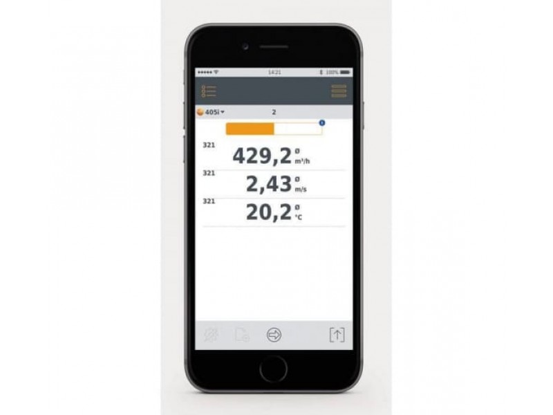 Анемометр с обогреваемой струной testo 405i представляет собой сочетание профессиональной измерительной технологии Testo с удобством управления через мобильное приложение, а значит, Вы получаете на своем устройстве многочисленные дополнительные функции для выполнения ежедневных рабочих задач. Мобильное приложение testo Smart Probes позволит Вам просматривать данные измерений на Вашем смартфоне или планшете. Вы больше не будете испытывать сложности при считывании показаний прибора даже в труднодоступных для измерения местах. Также приложение позволяет легко рассчитать объемный расход воздуха: просто введите параметры поперечного сечения воздуховода, и расчет будет произведен автоматически.
