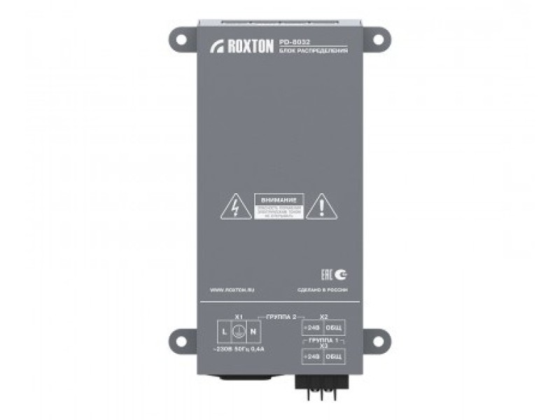 Распределитель питания ROXTON PD-8032 входит в состав системы ROXTON 8000. Распределитель предназначен для обеспечения дополнительного питания и разветвления соединений блоков обратной селекторной связи CS-8232 и абонентских панелей CP-8032. Для удобства подключения, распределитель имеет возможность подключения как по типологии «шина», так и по типологии «звезда». Особенностью распределителя является разветвление линии связи на 2-е гальванически развязанные линии.