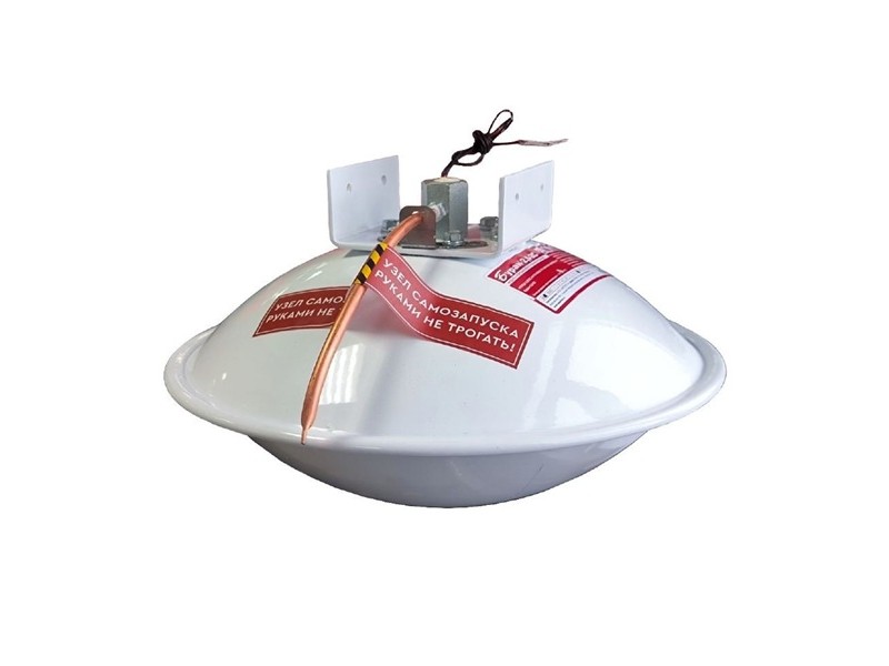 Нижняя полусфера представляет собой алюминиевую мембрану с нанесенными определенным образом насечками, по которым происходит разрыв мембраны при срабатывании модуля. Модуль подвешивается на потолке защищаемого объекта над возможным очагом возгорания.